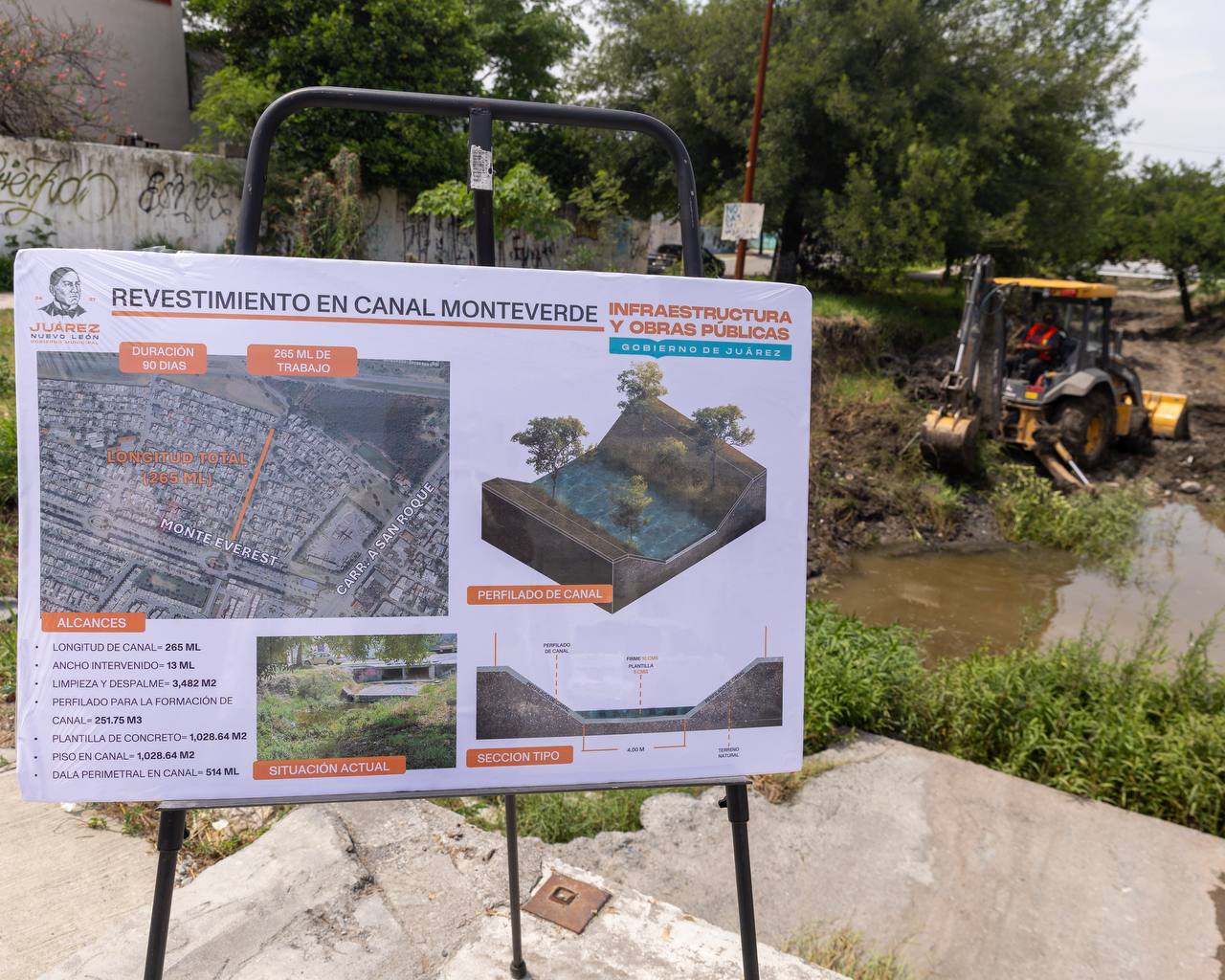 Por su parte, en la colonia Monte Verde, la intervención incluye 265 metros lineales de canal y labores de limpieza y despalme en una superficie de 3,482 metros cuadrados, abarcando del cruce con la calle Monte Everest, incluyendo la colocacion de plantilla y piso de concreto. Estas obras tienen el propósito de mejorar la capacidad de conducción del agua, evitar desbordamientos y fortalecer la infraestructura pluvial de la zona.