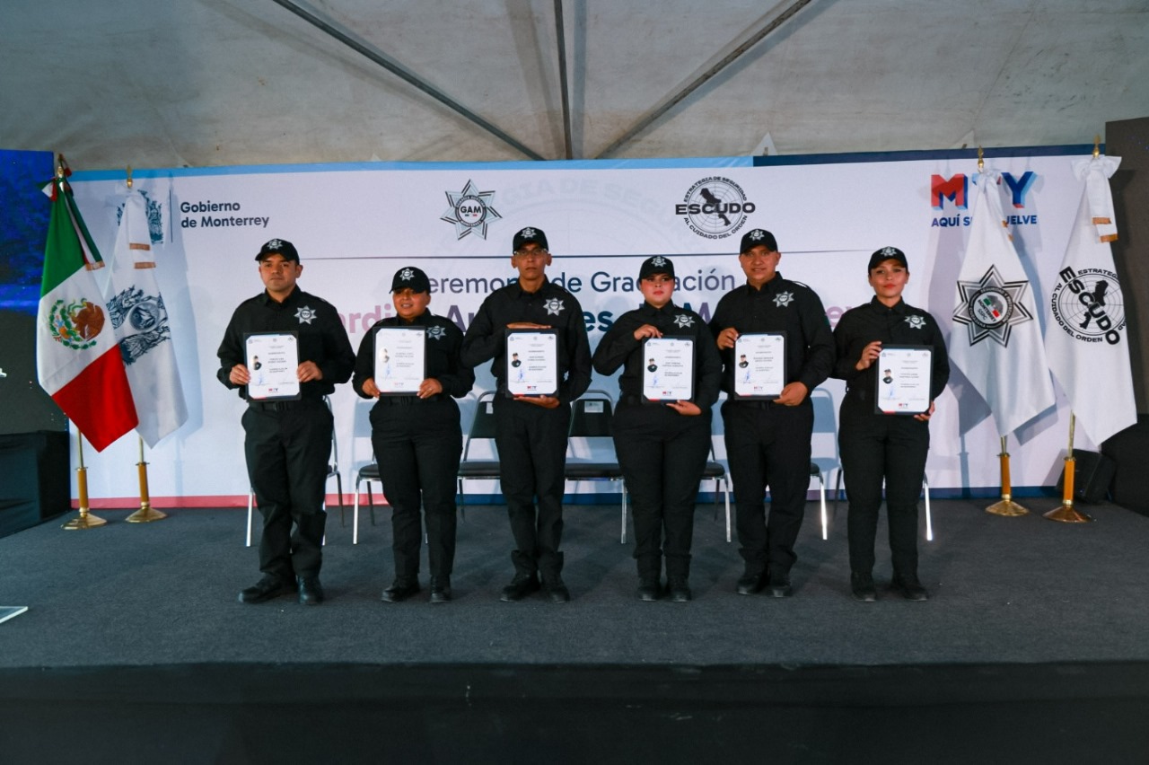 La tarde de este martes se realizó la ceremonia de graduación de la Guardia Auxiliar de Monterrey, con 64 hombres y 40 mujeres, ante la presencia de sus familias, en las instalaciones de la Academia, Formación y Especialización Policial de Monterrey.