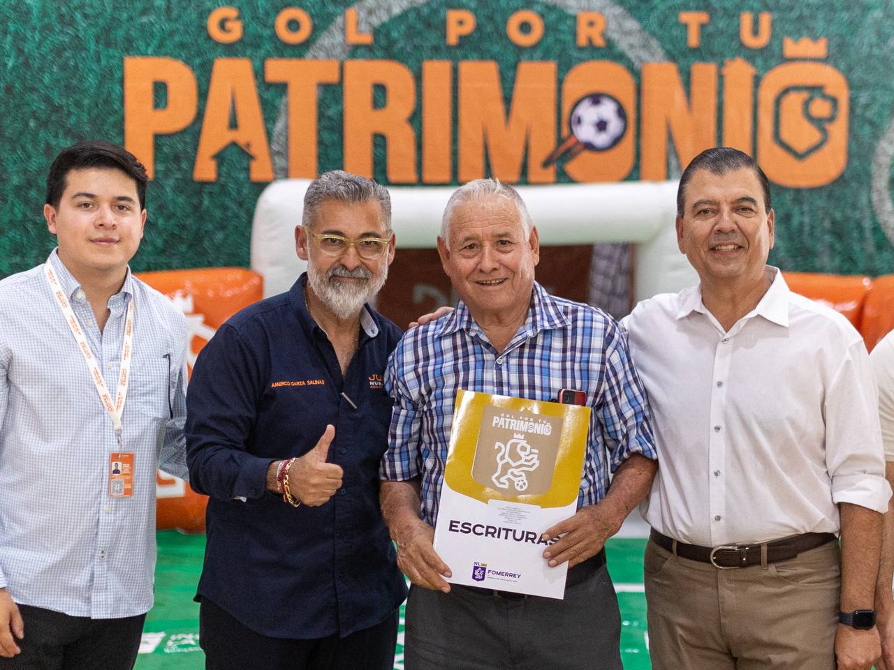 Durante el evento, los beneficiarios participaron en la dinámica “Gol por tu Patrimonio”, que consistió en lanzar un penalti simbólico para recibir sus escrituras, en sintonía con la próxima celebración del Mundial de Fútbol 2026, del cual Nuevo León será sede.