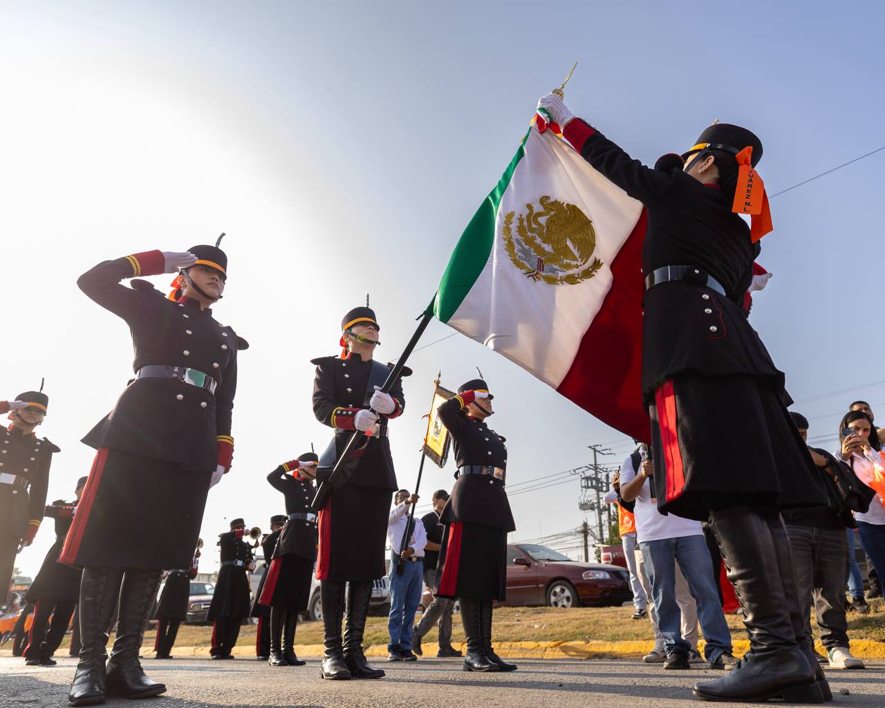 La Banda de Guerra Municipal y la Escolta Municipal marcaron el paso del desfile, mientras que dependencias como la Secretaría de Seguridad y Protección Ciudadana, Protección Civil y Bomberos, el DIF Juárez, la Secretaría de Servicios Públicos, entre otras áreas municipales, participaron representando el trabajo diario que realizan en beneficio del municipio.