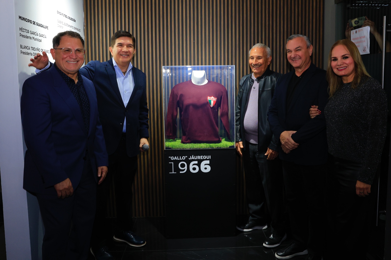 El alcalde Héctor García junto a Gabriel Bustamante, Fundador y Director del Museo Épica, facilitador de las piezas, cortaron el listón inaugural de la Exposición, que invita a las y los guadalupenses a considerarse parte activa del capítulo histórico de la Copa FIFA 2026 y que tendrá como sede el Estadio BBVA.