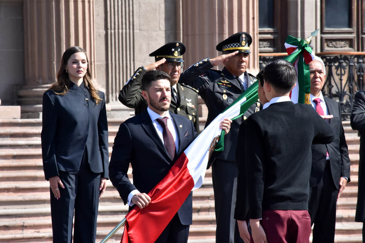 Monterrey, Nuevo León.- Al encabezar la Ceremonia Conmemorativa del Día de la Bandera, el Gobernador Samuel Alejandro García Sepúlveda dijo que los retos que enfrenta el país exigen honrarla, fortaleciendo a Nuevo León con resultados que estén a la altura de su historia.