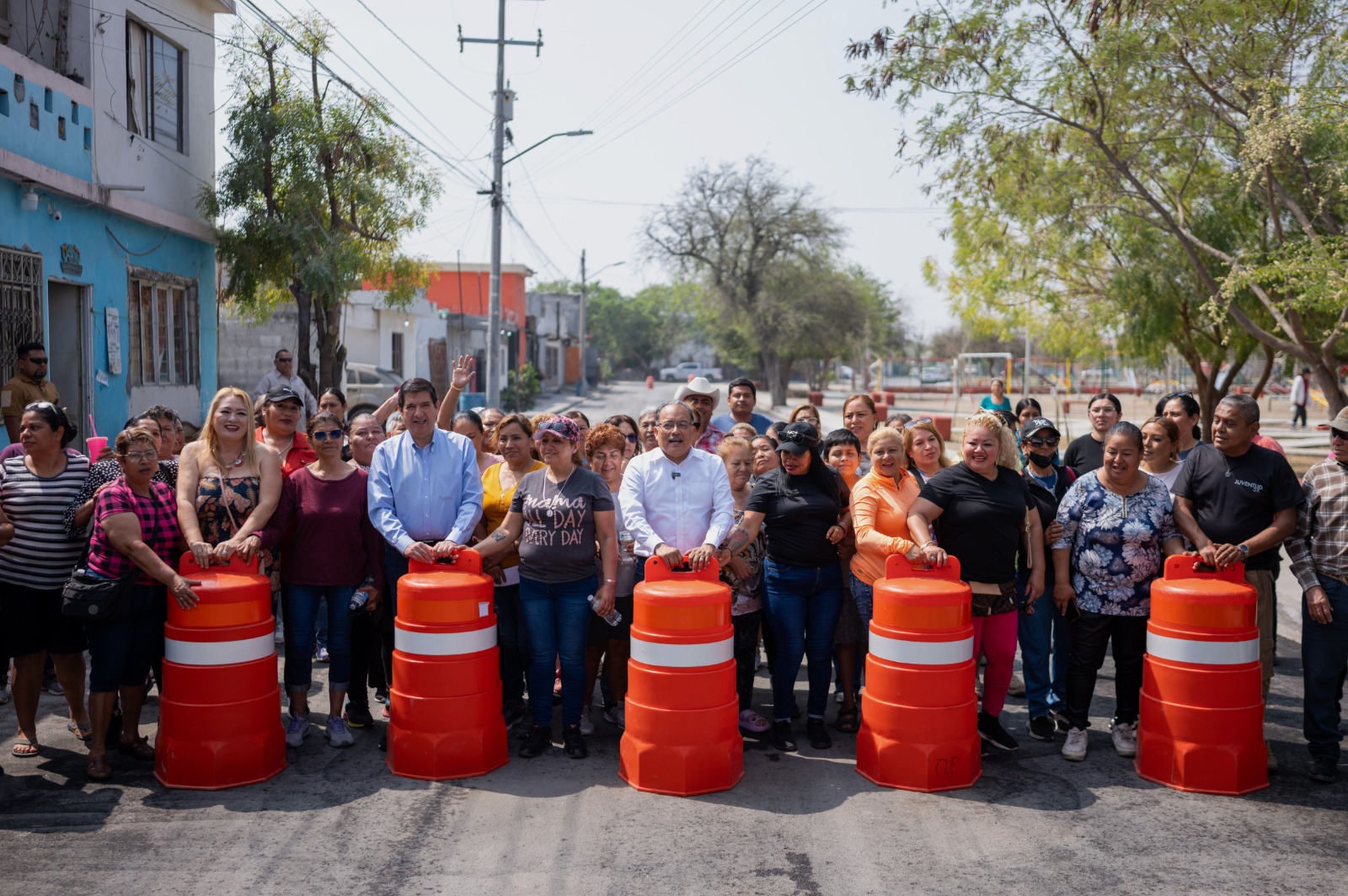 Mijes y Martiniano Rueda, secretario de Obras Públicas en compañía de los vecinos procedieron al retiro de trafitambos para la entrega de la calle Andrés Montoya, una de las arterias de mayor afluencia en la Colonia Nueva Esperanza.